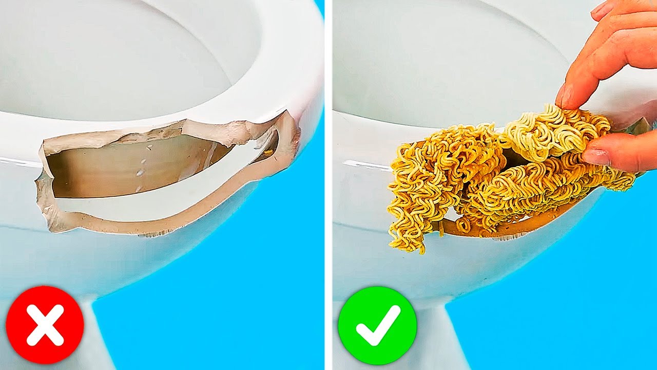 'Life hack' videos showing impossible DIY solutions — like fixing a broken sink with ramen noodles. AI-generated or not, it's slop that wastes your time and insults your intelligence.